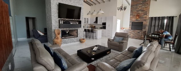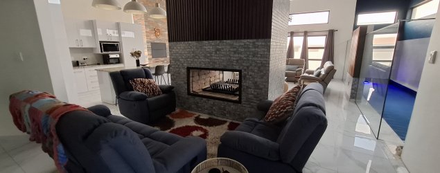 The open-plan living area boasts a cozy fireplace and a built-in indoor BBQ, perfect for year-round gatherings. A guest toilet/bathroom adds convenience, while the separate scullery/laundry room ensures a tidy, functional space.